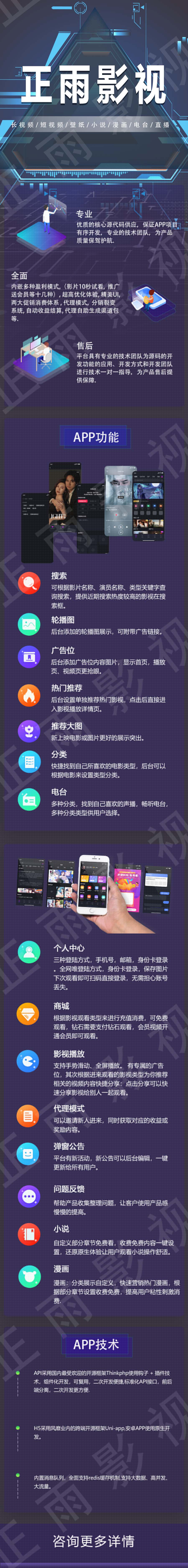内嵌多种盈利模式,(影片10秒试看, 免注册成为代理, 推广送会员等十几种), 超高优化体验, 精美UI, 两大促销消费体系 , 三级代理模式, 三级返利系统, 分销裂变系统, 自动收益结算, 超智能自定义客服聊天系统等等。可自由二开无限制。