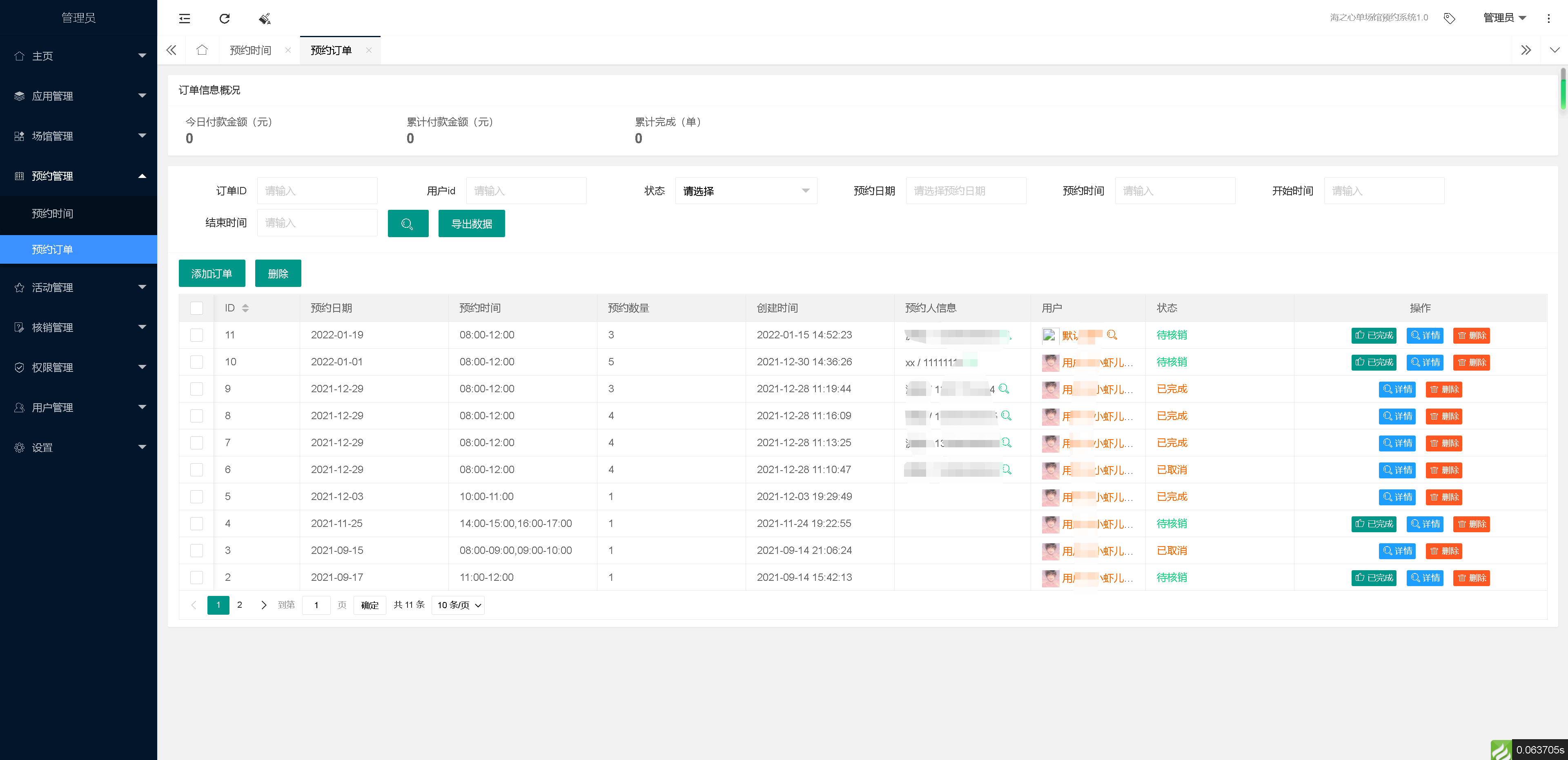 单场馆预约系统,按时间预约,预约人需填写手机号、姓名、证件,常用于科技馆预约、美术馆预约等场馆系统,也可以用于其他适用的预约场景。