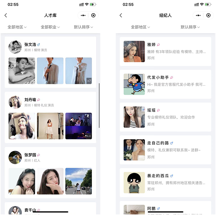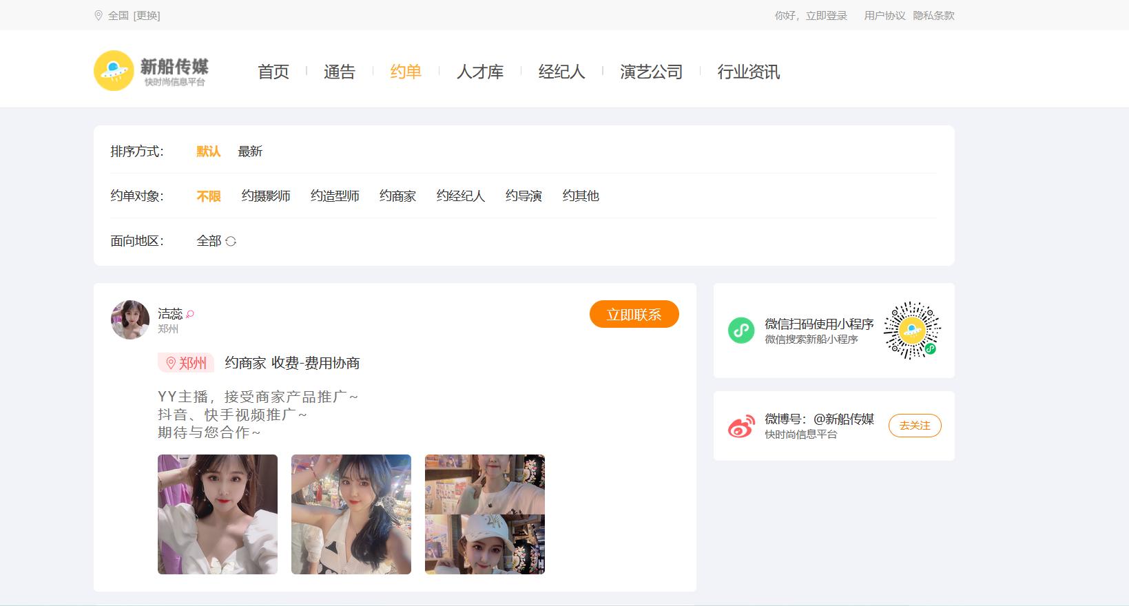 2,约单:用户展示作品、形象照片、约单详情、收费标准等信息,商家确定合适人选联系合作。