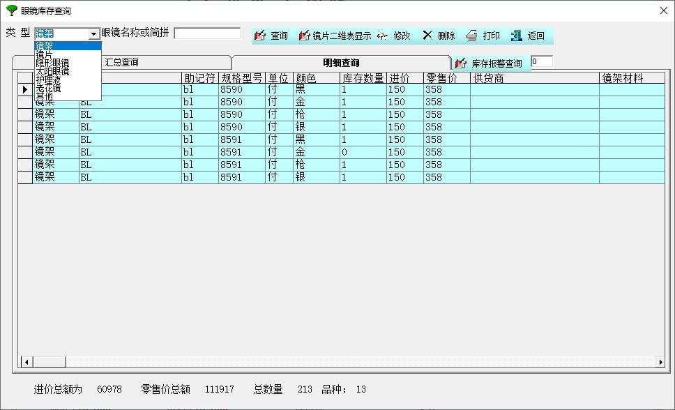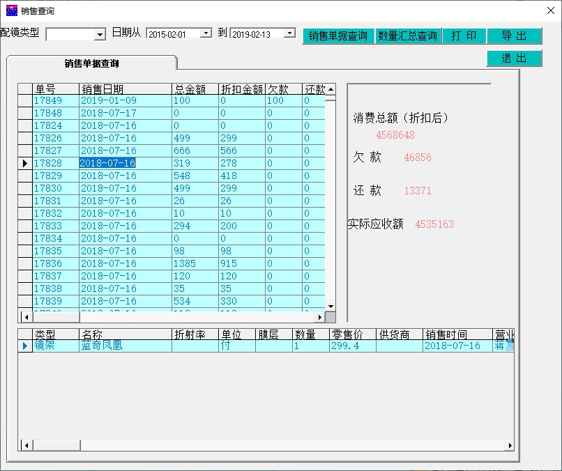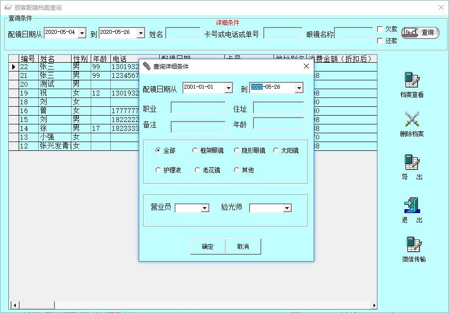 可以根据具体条件对顾客配镜信息进行查看,删除,修改或者导出到excel表进行操作