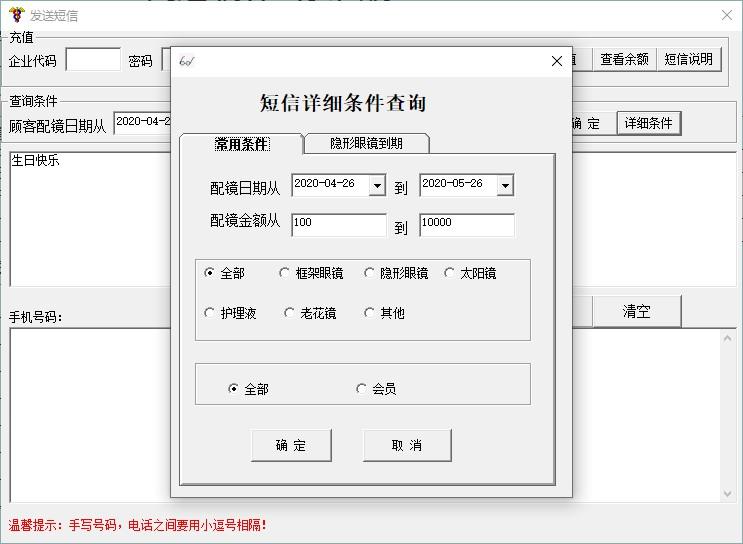 生日提醒:查询顾客生日信息,发送祝福短信(需开通短信群发功能)