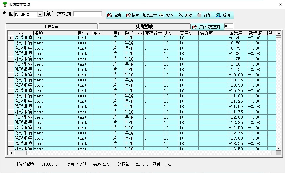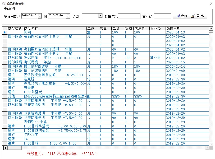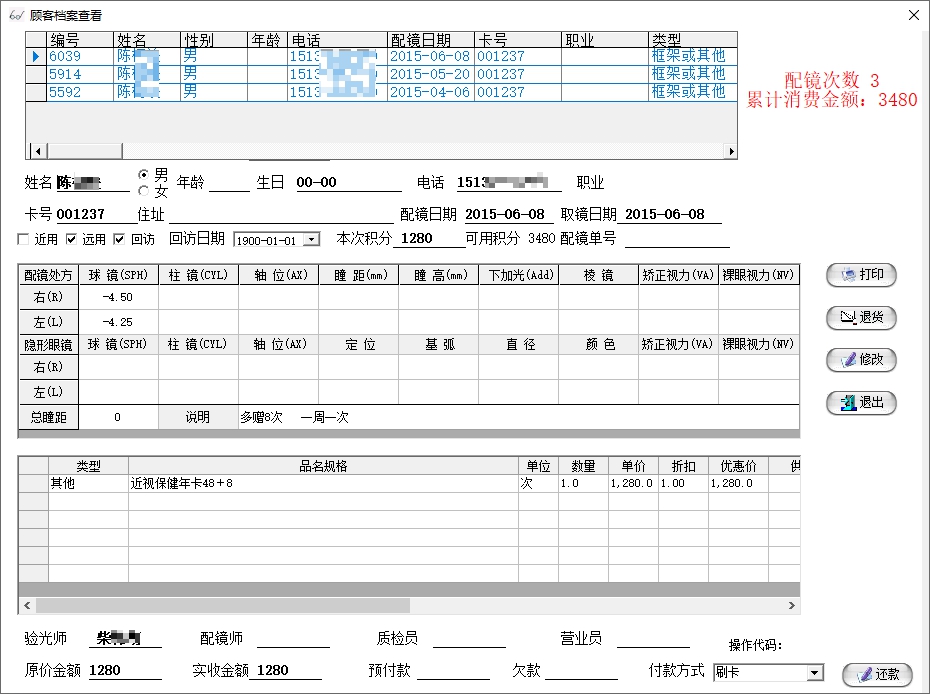 并且可以在查询结果显示当前客户所有配镜信息,如时间,配镜类型,积分情况等