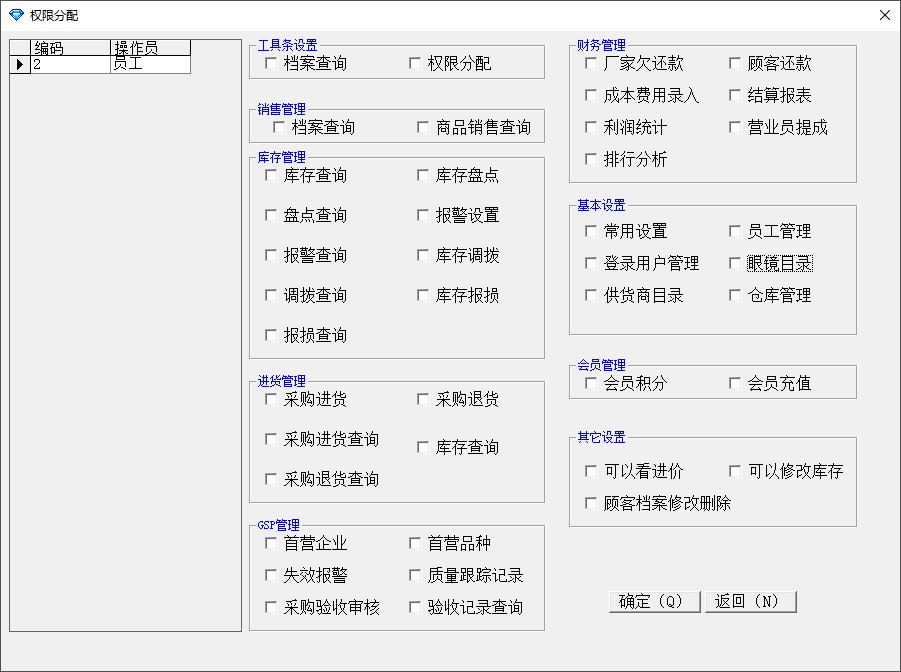 进销存管理、顾客档案、厂家欠还款、磁卡查询、生日提醒、销售统计、会员积分、会员充值,商品库存管理、商品退货、群发短信,针对隐形眼镜GSP认证管理(包括生产厂家、批号、失效期、首营企业等),隐形眼镜顾客到期回访,财务统计分析,商品条形码扫描,员工的权限分配角色,商品库存预警、盘点、补货等强大功能