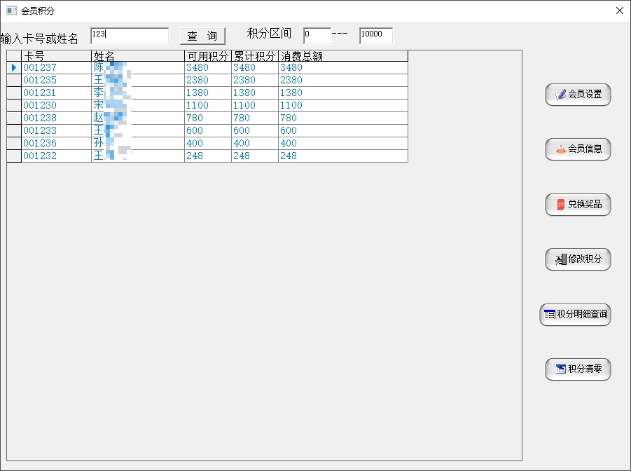 可以查询会员积分情况,并且对积分进行增加,减少,礼品兑换和积分详情查看等