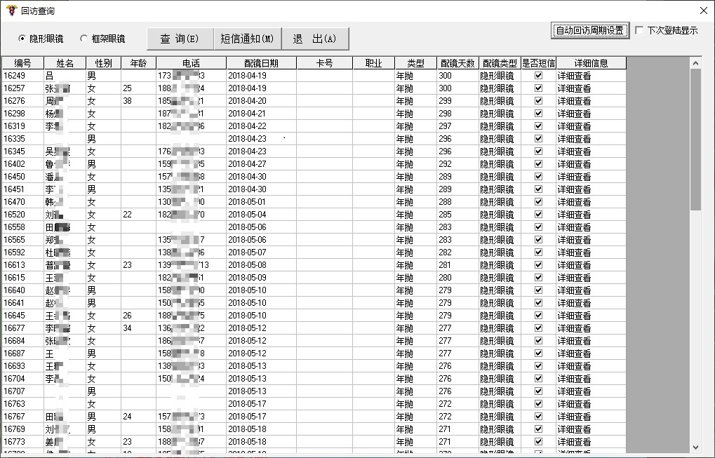 可以对指定/区间内的指定配镜类型(隐形/框架)顾客进行查询,回访