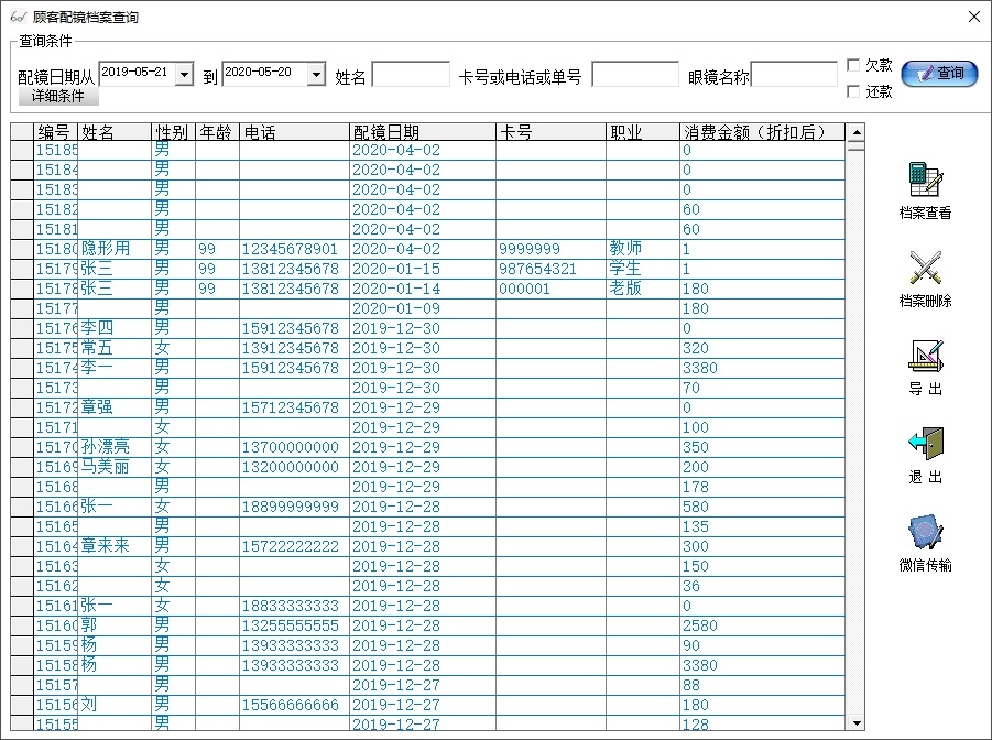 顾客信息查询,可以根据日期,电话,卡号,价格,配镜名称等一系列条件进行详细查询