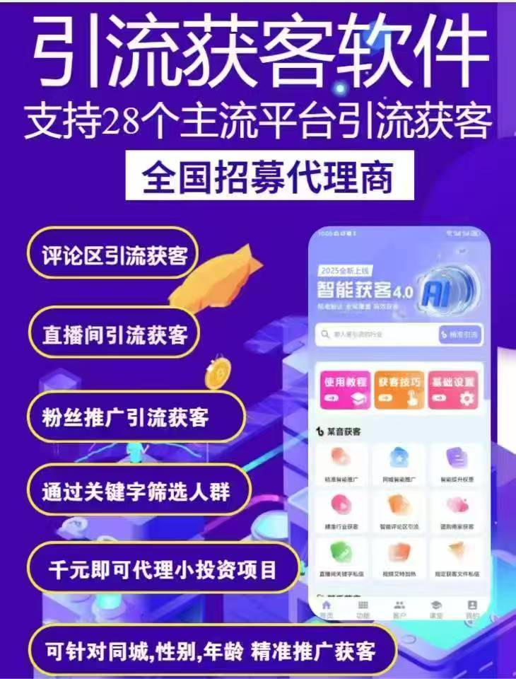 引流获客平台,支持28种主流平台引流获客,评论区引流获客,直播间引流获客,粉丝推广引流获客,可针对同城,性别,年龄,精准推广获客。