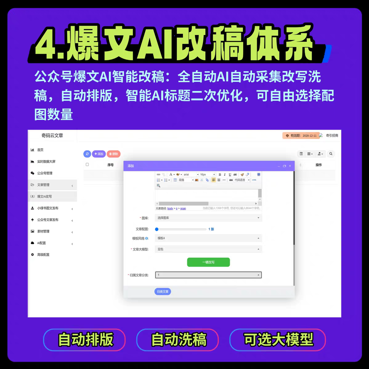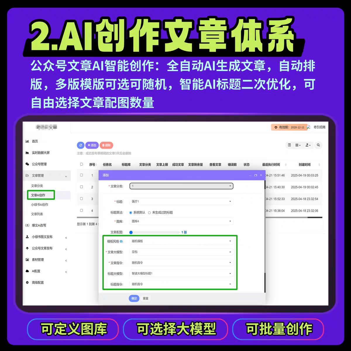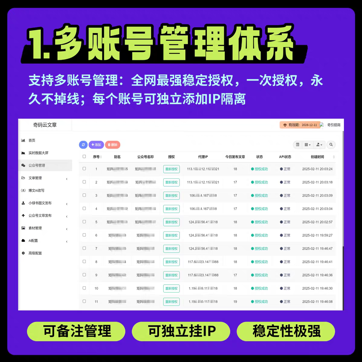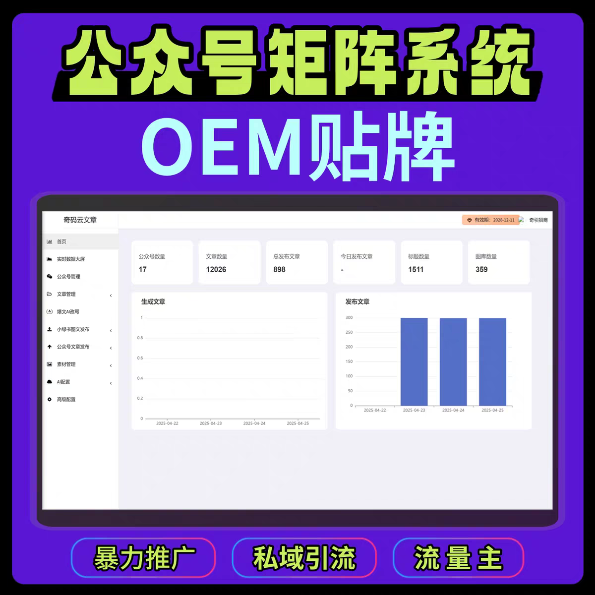 公众号批量发文系统- 核心能力:支持多账号管理、图文/视频内容批量上传、定时发布;自带内容查重、排版模板功能,大幅提升公众号运营效率。 – 适用人群:自媒体工作室、企业新媒体部门、多账号运营者。